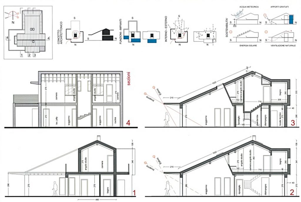Il volume della casa, se pur articolato, contiene le superfici disperdenti (con un buon S/V) ed é definito da una strategia precisa: