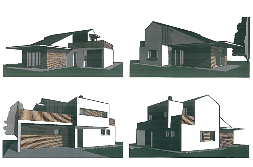 Il piano terra (base) é definito da un recinto protettivo; verso lo spazio pubblico, solo in corrispondenza della porta di ingresso e del vicino box le finiture sono previste “calde” e tattili, ovvero in liste di larice. Sopra tale basamento il primo piano é formato dal volume archetipo della casa a capanna, le cui falde di copertura in lamiera si estendono a Nord (per locali servizi al primo piano) e a Sud a proteggere l’estensione del soggiorno al piano terra, proteso verso il giardino.